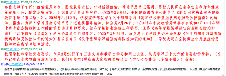 2020年3月26日(周四)下昼,,,,,,纲要党支部书记施亚利在红太阳武工纲要要党支部QQ群上,,,,,,安排了学习使命,,,,,,要求各成员凭证马院学习防控知识通知要求,,,,,,重点学习了《手册》、《指南》。。。。。。。阻止3月28日晚,,,,,,纲要党支部列位成员经由认真学习,,,,,,撰写了学习的心得体会,,,,,,并提交给支部书记。。。。。。。
