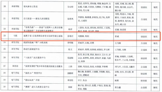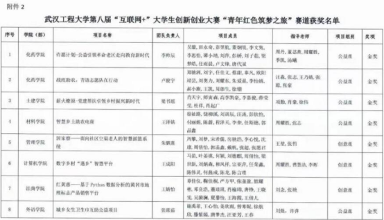 (通讯员:肖雅钰 雷翊君)为作育立异创业人才,,,,,一连引发大学生立异创业热情,,,,,展示立异创业效果,,,,,立异创业学院、教务处、学生处、校团委、研究生院团结主理了武汉工程大学第八届“互联网+”大学生立异创业大赛。。。。。经学院推荐、校赛组委会组织专家评审,,,,,最终评出高教主赛道金奖项目75个、银奖项目115个、铜奖项目127个;;;;;;;“青年红色筑梦之旅”赛道金奖项目10个、银奖项目17个、铜奖项目19个;;;;;;;工业赛道金奖项目7个、银奖项目11个、铜奖项目13个。。。。。我院喜获高教主赛道研究生首创组校级金奖1项、“青年红色筑梦之旅”公益赛道校级金奖、校级银奖各1项。。。。。