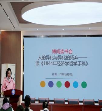 (通讯员:范鑫)2023年3月9日下昼16点,,,,,,,我院第109期“博闻念书会”在公海555000jc线路检测中心官网112多功效厅召开。。。。。。。。本次聚会以“人的异化与异化的扬弃——读《1844年经济学哲学手稿》”为主题,,,,,,,围绕人的异化的形成缘故原由、人的异化的体现、扬弃异化的主要途径和异化理论的意义等四个方面睁开讨论。。。。。。。。本次念书会由李齐先生主持,,,,,,,公海555000jc线路检测中心官网全体在校研究生加入。。。。。。。。本次念书会的九位主讲人为马院硕士研究生肖琪、尚富阳、周雪、李梦依、朱梦圆、张蕊、陈典华、李晨昂、王明振。。。。。。。。