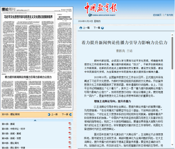 (通讯员 兰洁 赵文)2024年1月18日,,,,,,公海555000jc线路检测中心官网曹胜亮教授、兰洁博士在《中国教育报》(理论版)揭晓了一篇题为《着力提升新闻舆论撒播力指导力影响力公信力》的文章。。。。。。文章深入叙述了新时代配景下,,,,,,怎样贯彻落实习近平文化头脑,,,,,,提高新闻舆论的撒播力、指导力、影响力和公信力。。。。。。