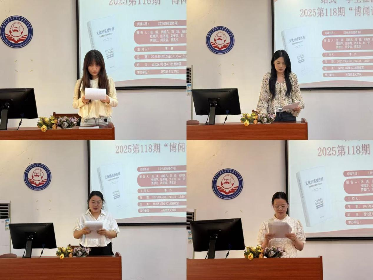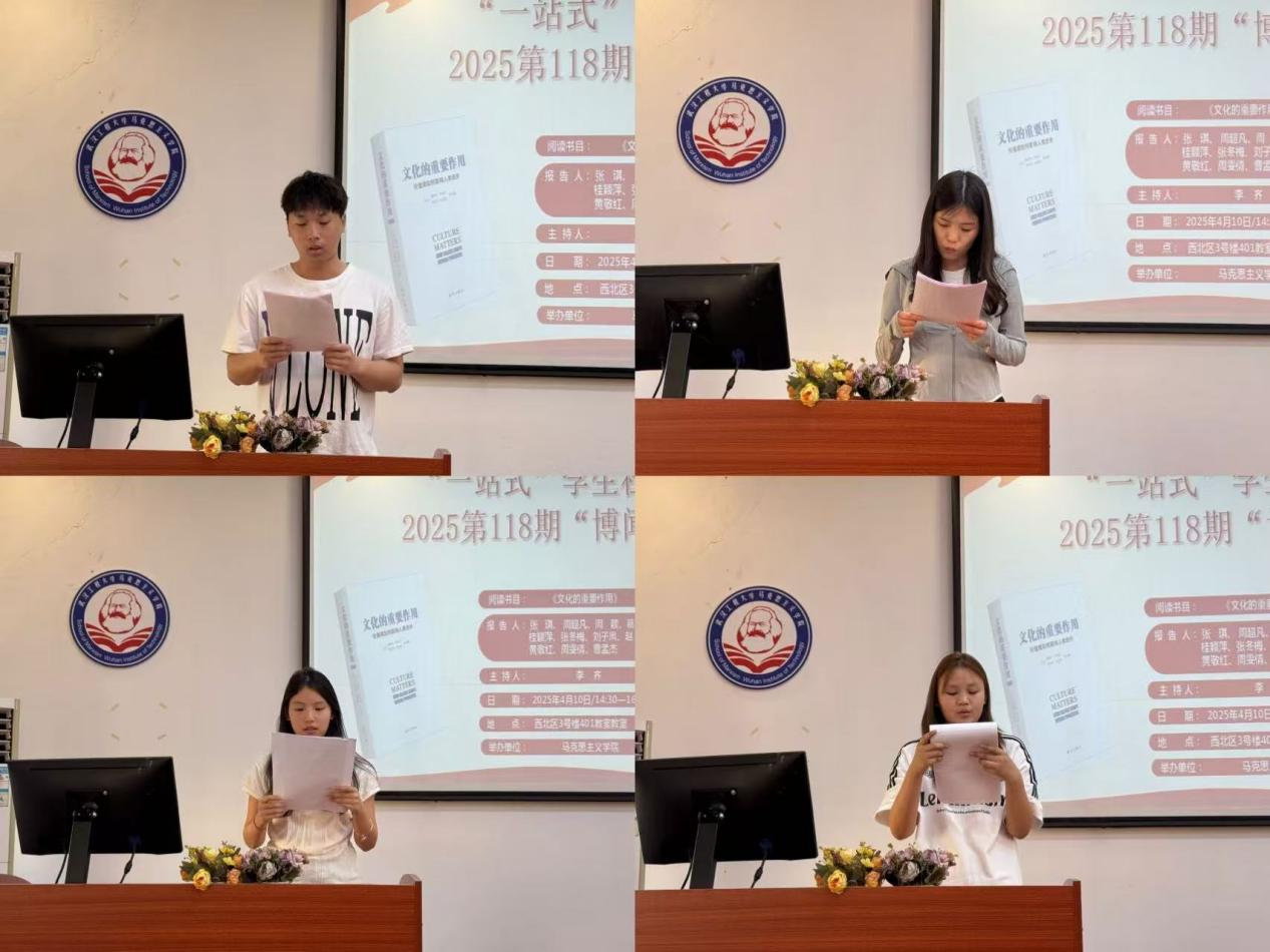 本网讯(通讯员 刘欣 张洋洋)4月10号下昼,,,,,,,,我院第118期“博闻念书会”在公海555000jc线路检测中心官网一站式学生社区中心(求是楼401课堂)顺遂召开。。。。。本次念书会围绕着亨廷顿、哈里森的著作《文化的主要作用》睁开讨论。。。。。本次念书会由李齐先生主持。。。。。加入此次念书会的11位研究生主讲人为24级周雯情、张琪、周颖、周超凡、黄敬红、曹孟杰、刘子凤、张冬梅、葛明悦 、桂颖萍、赵芽。。。。。院学术部“博闻念书会”运动小组组织了此次念书会。。。。。