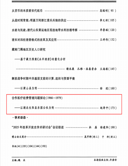 本网讯(通讯员 赵泽中)我院赵泽中先生在《中国经济史研究》揭晓题为《相助医疗经费治理问题探论(1966—1979)——以湖北长阳县乐园公社为例》的论文。。。。。。。。