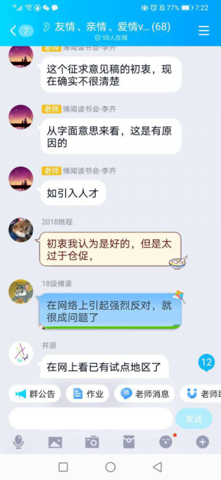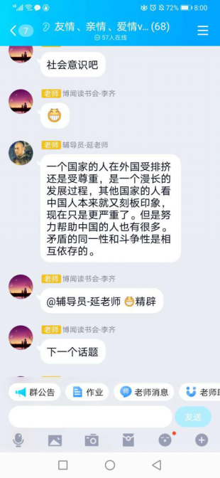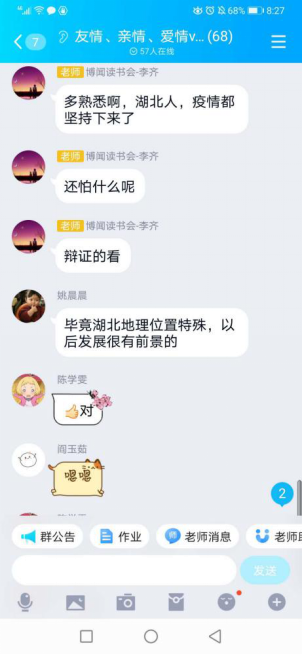 在以“友情、亲情、恋爱VS疫情”命名的QQ群中,,,,,,李齐先生与延飞先生向导同砚们知无不言,,,,,,分享自己的念书心得与感悟。。。。。。。。涉及的话题从外国人永居条例到网络羁系,,,,,,从医患关系与疫情后湖北省就业问题,,,,,,短短两个多小时,,,,,,讲话达几千条,,,,,,同砚们收获满满。。。。。。。。